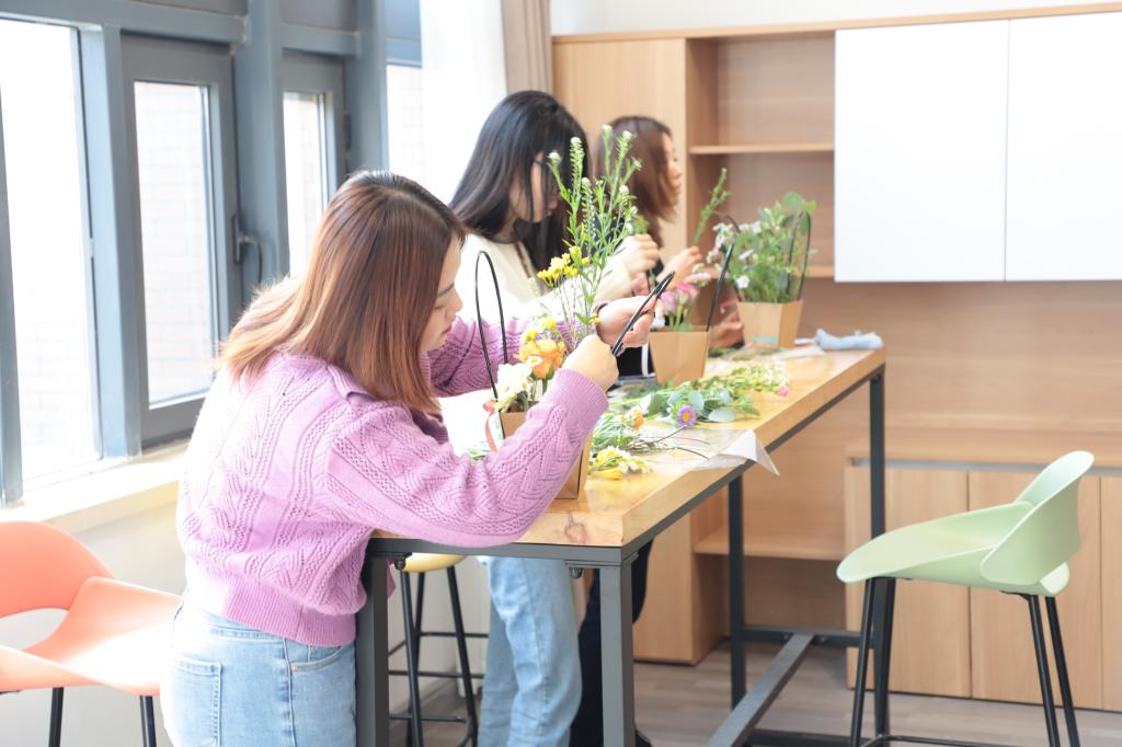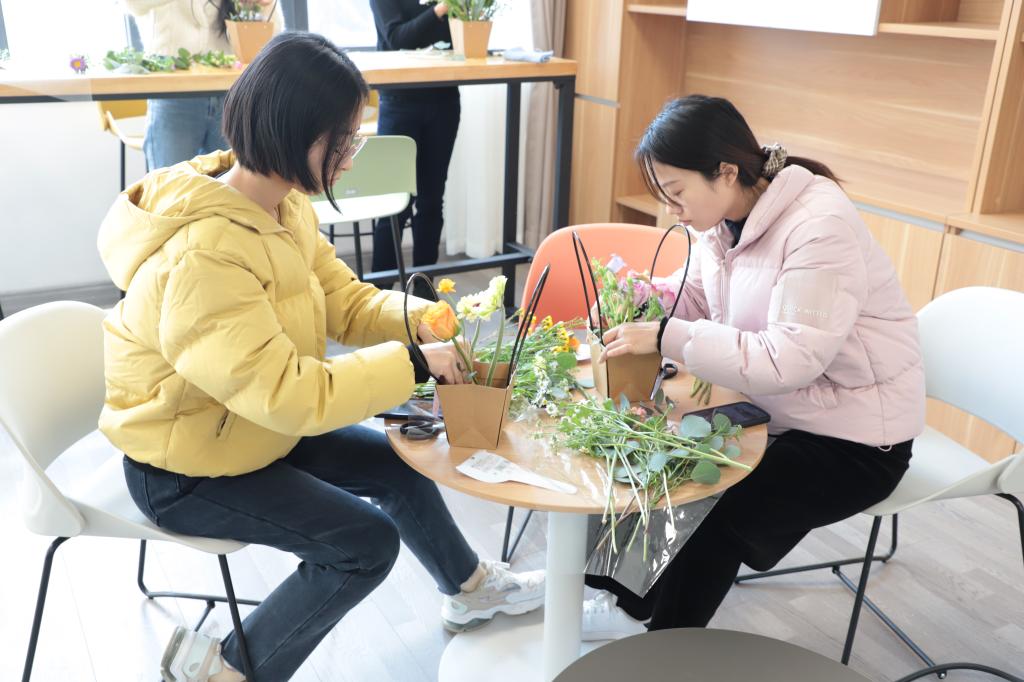 一修一剪之间,桌上一束束细致精美、别出心裁的插花作品逐渐完工,一篮蓝独一无二的作品诞生,让人仿佛置身一片花海,芬芳沁人心脾,美丽愉悦精神。大家一边精心创作,一边享受着插花的乐趣,脸上洋溢出幸福的笑容。