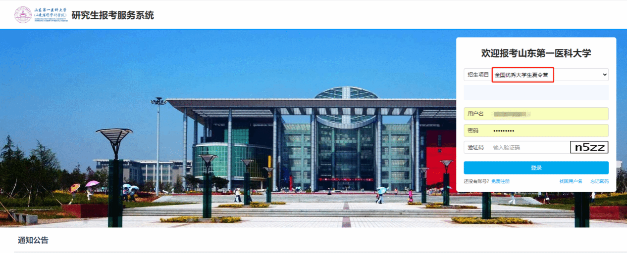 1、登录谈球吧研究生报考服务系统https://yjszs.sdfmu.edu.cn,点击“全国优秀老员工夏令营”,首次点击“免费注册”注册账号。