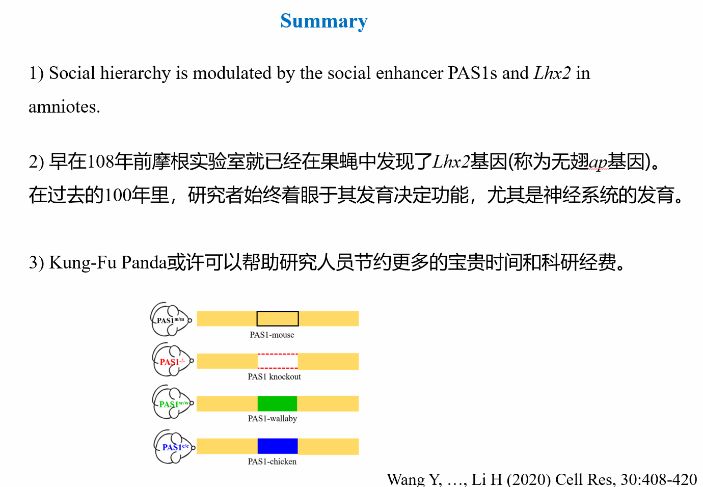 李海鹏研究员通过发展数学分析和进化生物学新理论,开发了检测正选择的新方法。全基因组扫描结果显示,在胎盘哺乳动物形成阶段,正选择作用最显著的区间位于大脑发育关键转录因子Lhx2基因上游的非编码区PAS1。基于生物信息学分析、表观遗传学、细胞实验、转基因小鼠胚胎、转基因鸡胚的实验均证实,PAS1是Lhx2基因的增强子,并且不同物种的PAS1可以差异性调控Lhx2基因的表达。在敲除PAS1增强子之后,小鼠完全丧失了形成社会阶层的能力,揭示PAS1是形成社会阶层所必须的。PAS1敲入小鼠模型表明,不同的PAS1等位基因可以决定小鼠自身所处的社会阶层,并且突变PAS1可反转社会阶层。未发表的实验结果进一步表明,增强子PAS1突变品系的小鼠,社会交往能力正常,但PAS1敲除小鼠的后肢协调能力则相对野生型较弱,揭示了社会体系产生和维持的遗传基础。李海鹏研究员也探讨了建立社会均一化小鼠的可能性,以及PAS1对抑郁症治疗潜在的促进作用。